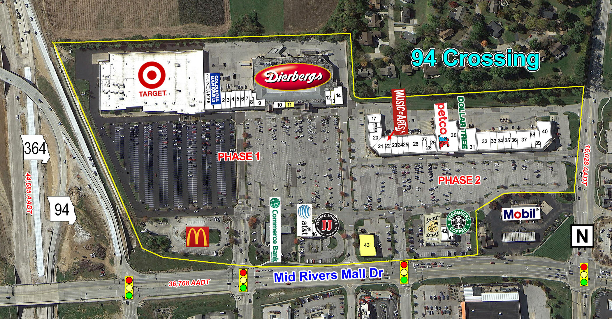 Located at the intersection of Highway 94 and Mid Rivers Mall Drive. Easy access to Mid Rivers Mall Drive with 2 traffic signals serving the Shopping Center.  This Shopping Center is anchored by Target, Dierbergs and Petco.