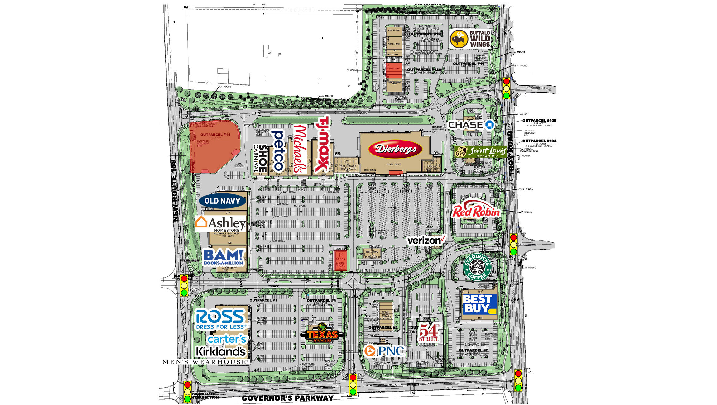 Located at the intersection of Governors’ Parkway and New Route 159 in Edwardsville, Illinois. Easy access to New Route 159, Troy Road and Governors’ Parkway with 4 traffic signals serving the Shoppign Center. This Shopping Center is anchored by several large retailers including Dierbergs, Michaels, TJ Maxx, Petco, Old Navy, Ashley Furniture, Books-A-Million, Ross Dress for Less, Carters, Kirkland’s, Men’s Wearhouse, and Best Buy.
